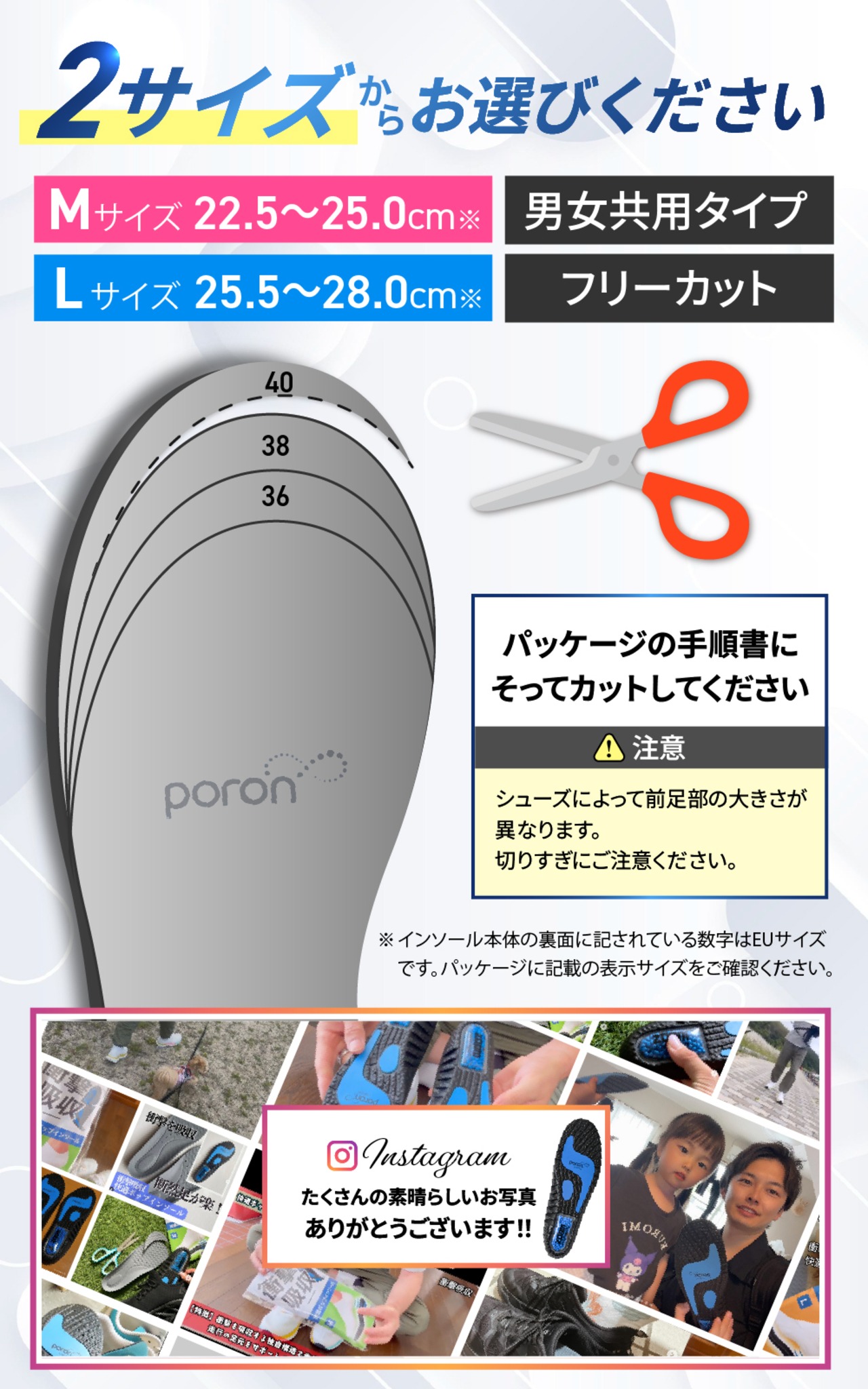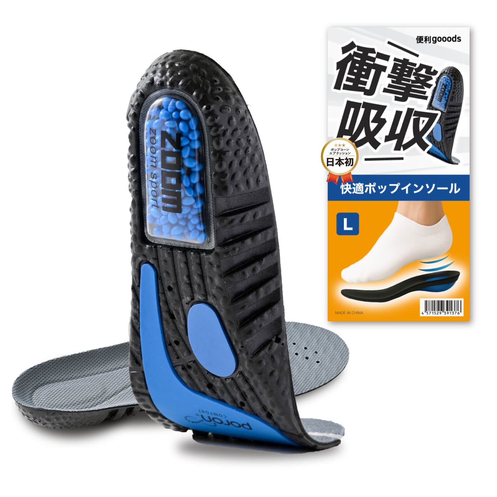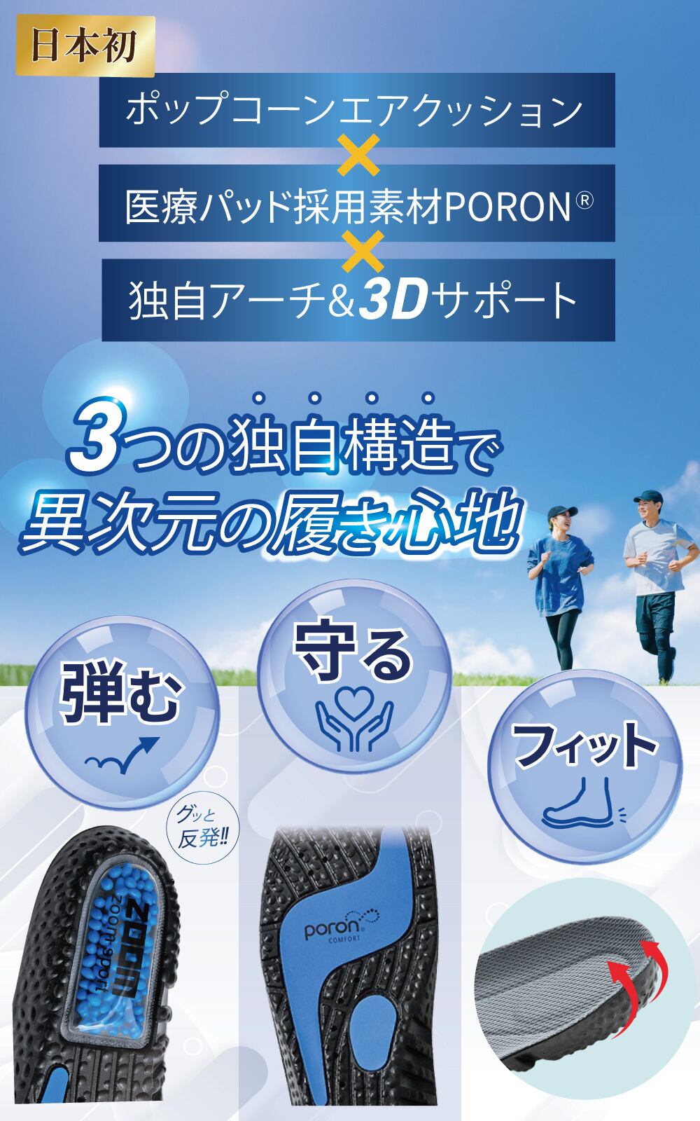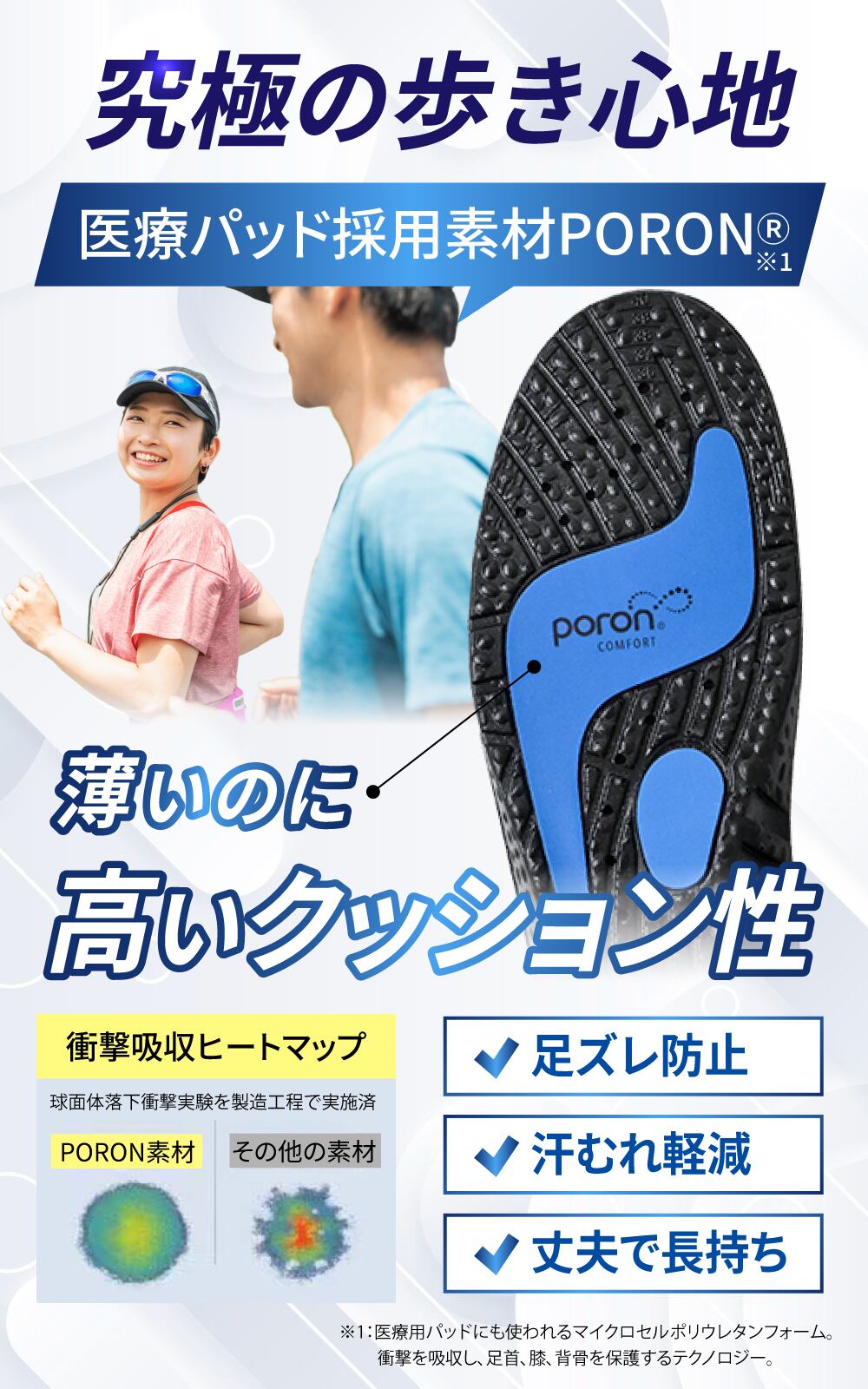 【衝撃吸収 PORON素材】 医療用パッドにも採用される高機能クッション材で膝・腰へのダメージを軽減しできる疲れないインソール