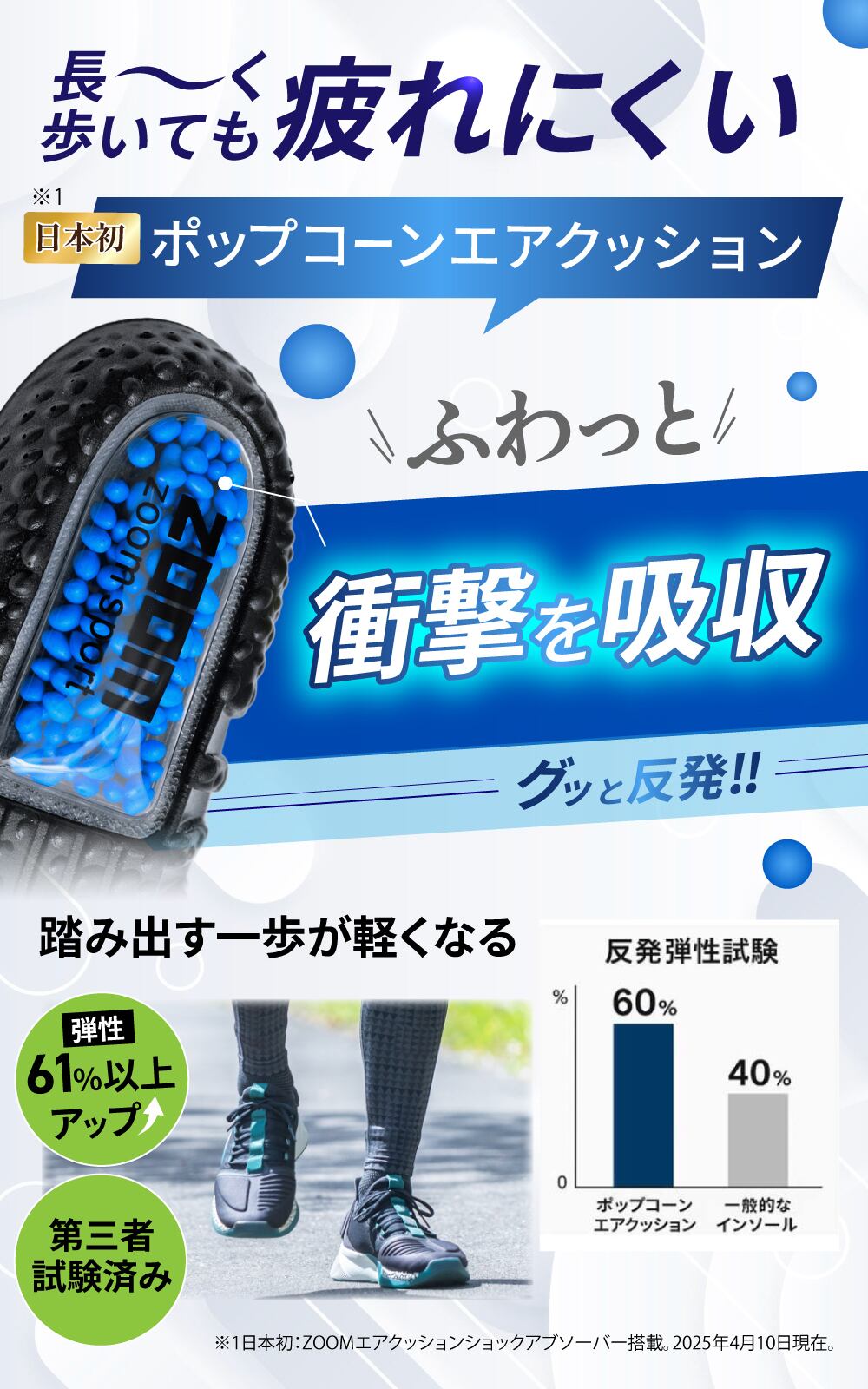 【ポップコーンエアクッション搭載】 高反発PUフォームが足裏全体を優しく支え、衝撃を吸収。立ち仕事や通勤時も疲れにくい快適インソール。